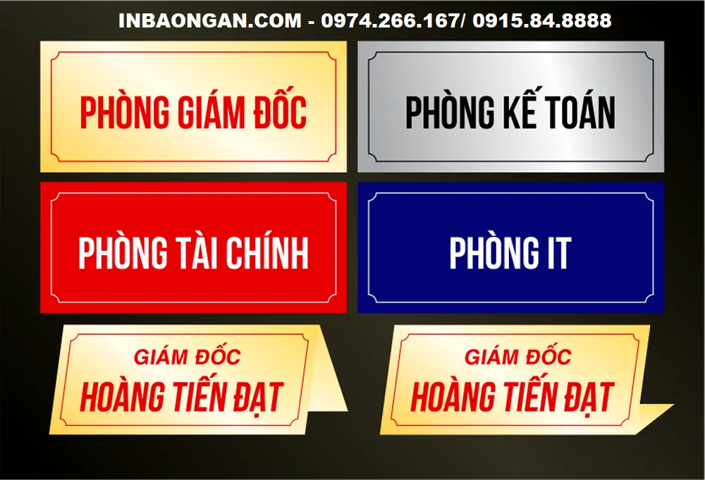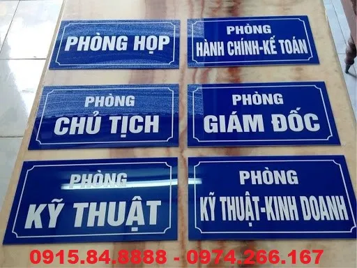 Đối với các công ty, doanh nghiệp, các văn phòng thì việc có Biển phòng ban là không thể thiếu. Nó thường được treo phía trên trước cửa ra vào của mỗi phòng ban theo từng chức vụ khác nhau của mỗi cá nhân trong công ty, ví dụ như biển: Giám đốc, phó giám đốc, kế toán, lễ tân, kinh doanh….