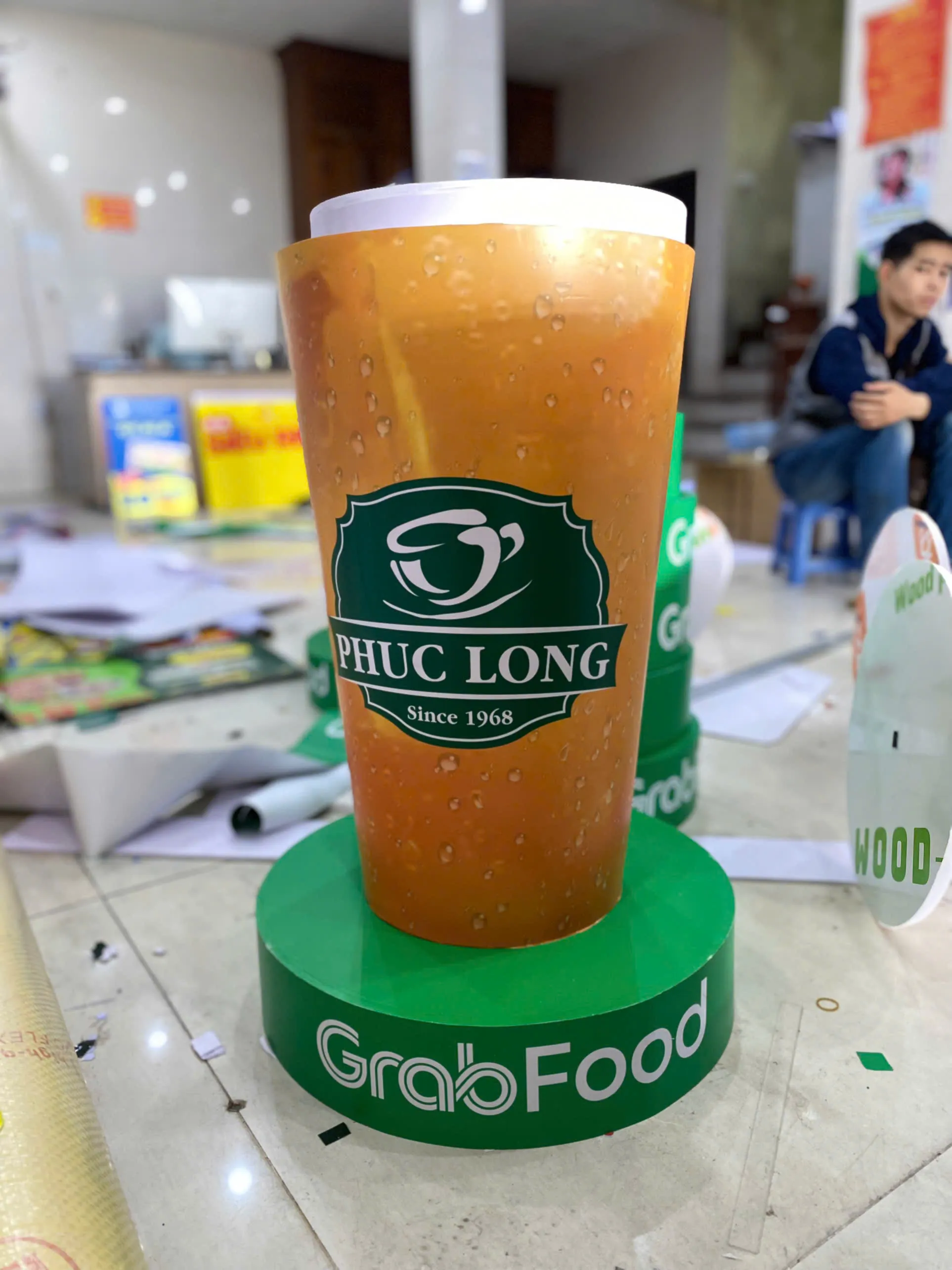 4. Gắn đế trưng bày Thiết kế đế hình tròn có in logo GrabFood hoặc theo yêu cầu đối tác. Gắn chặt thân cốc vào đế bằng keo chuyên dụng hoặc vít cố định. Kiểm tra độ cân đối, chắc chắn của mô hình.